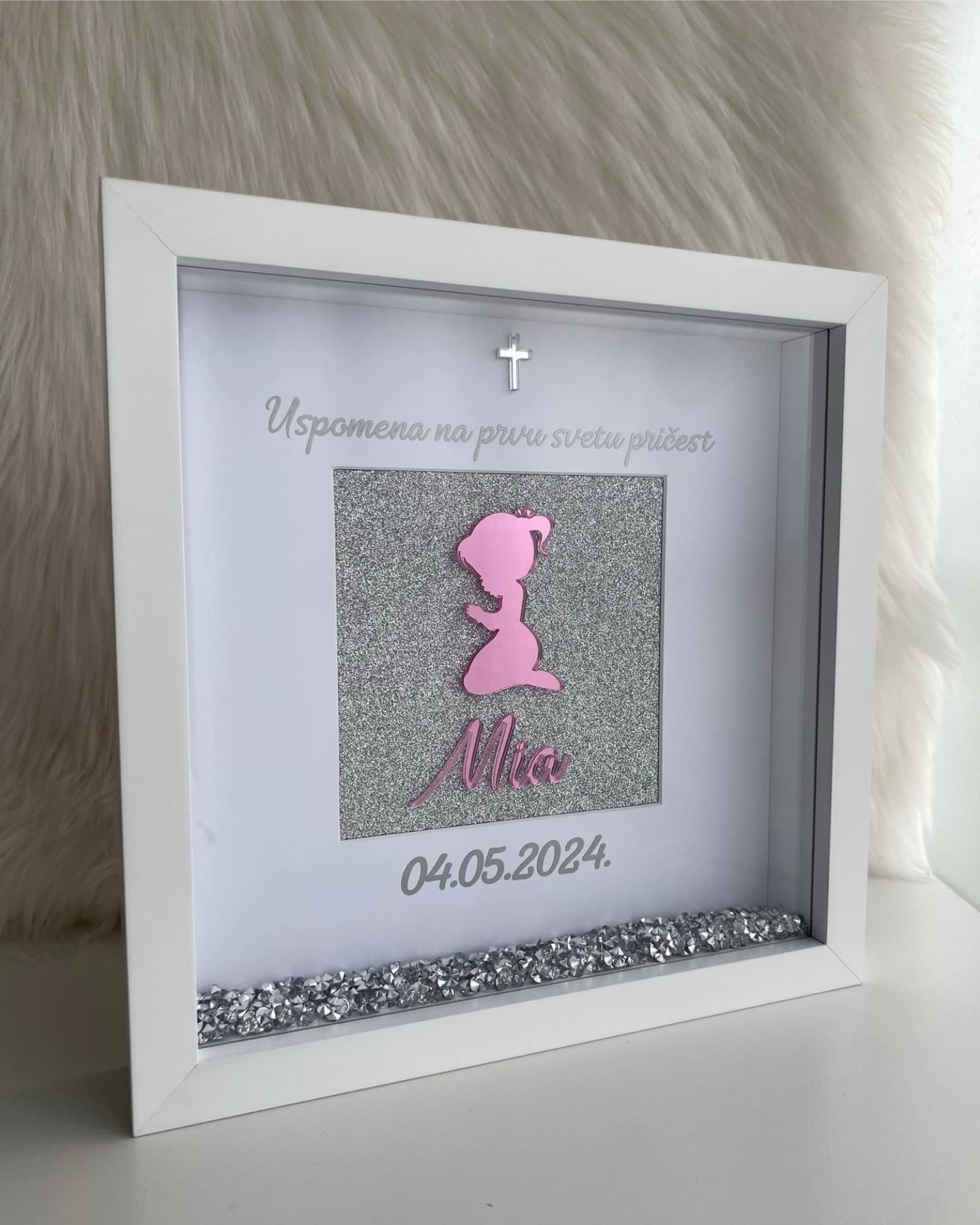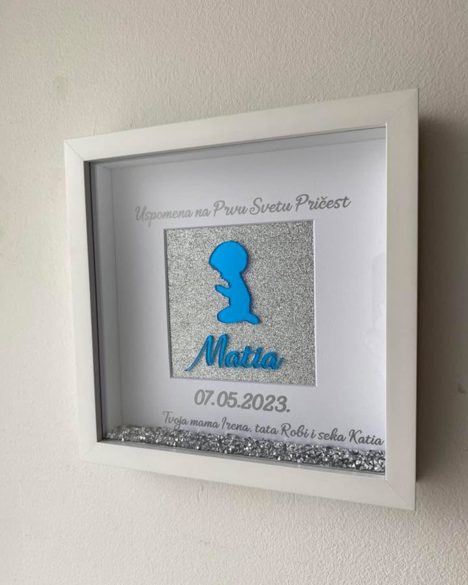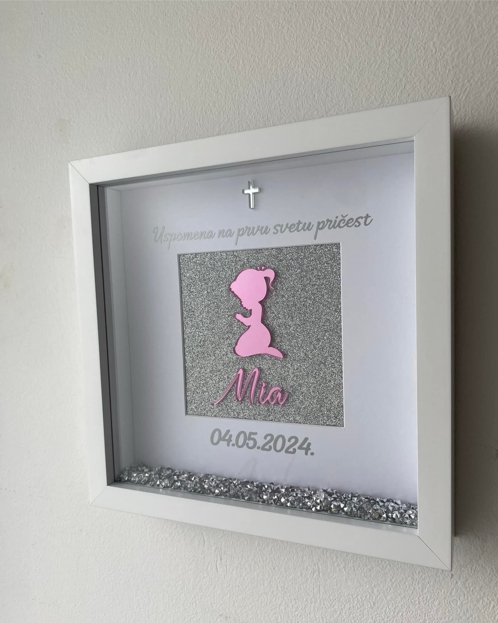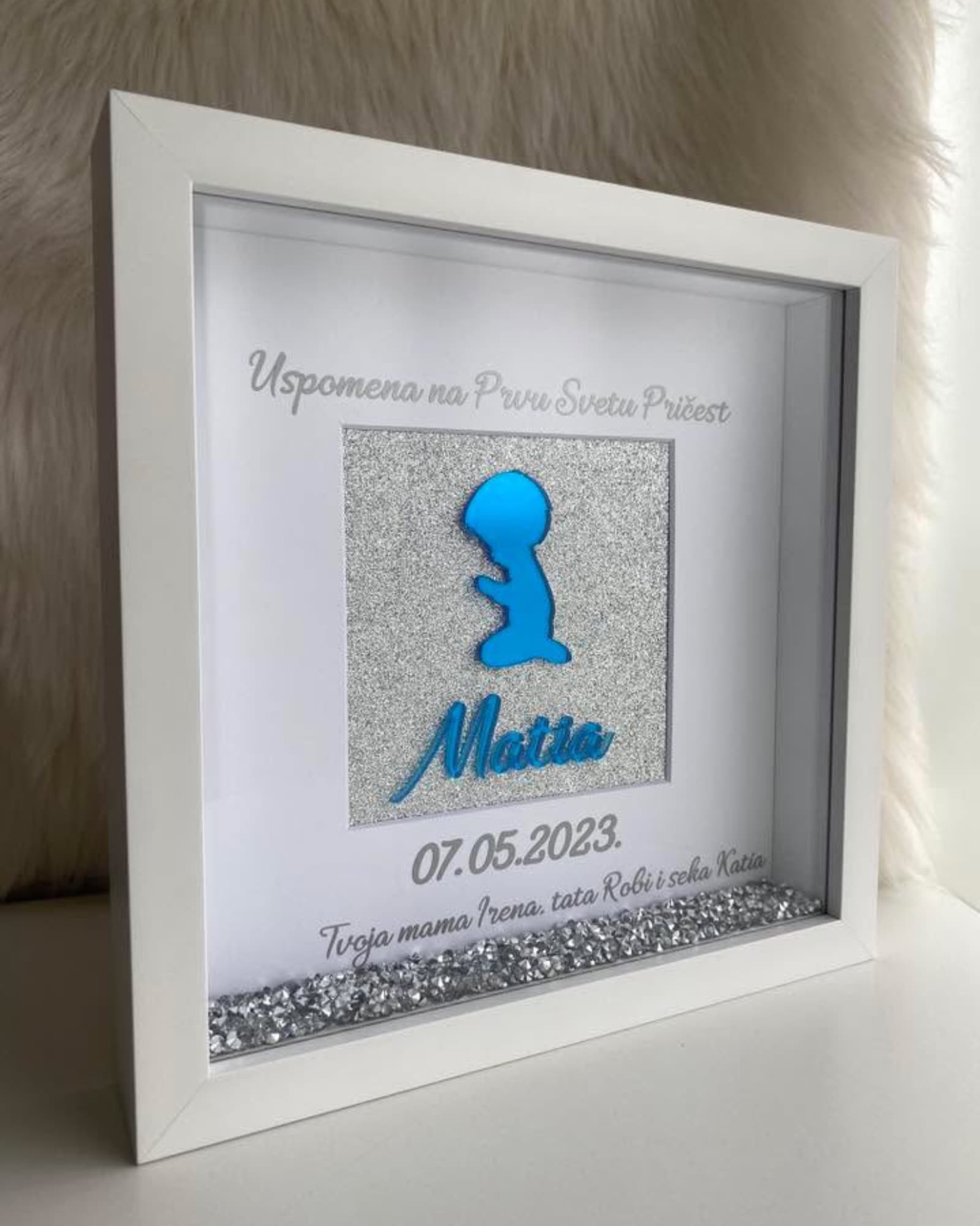 Zrcalni detalji daju mu poseban, profinjen izgled koji će se savršeno uklopiti u dječju sobu. Ovaj okvir čuva uspomenu na sakrament krštenja, pričesti ili krizme i ostaje trajna uspomena obitelji.