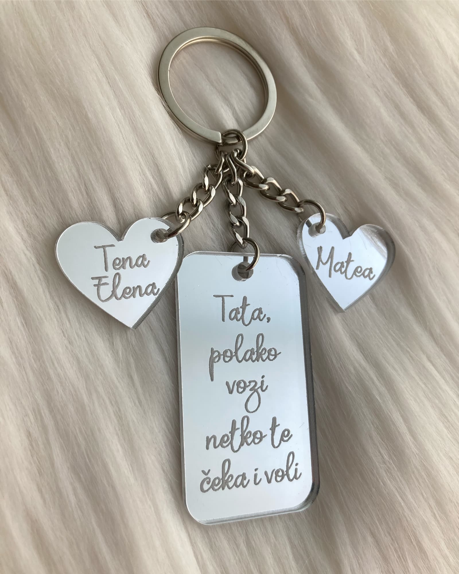 Privjesak za ključeve od zrcalnog plexiglassa s porukom “Tata, polako vozi – netko te čeka i voli”.