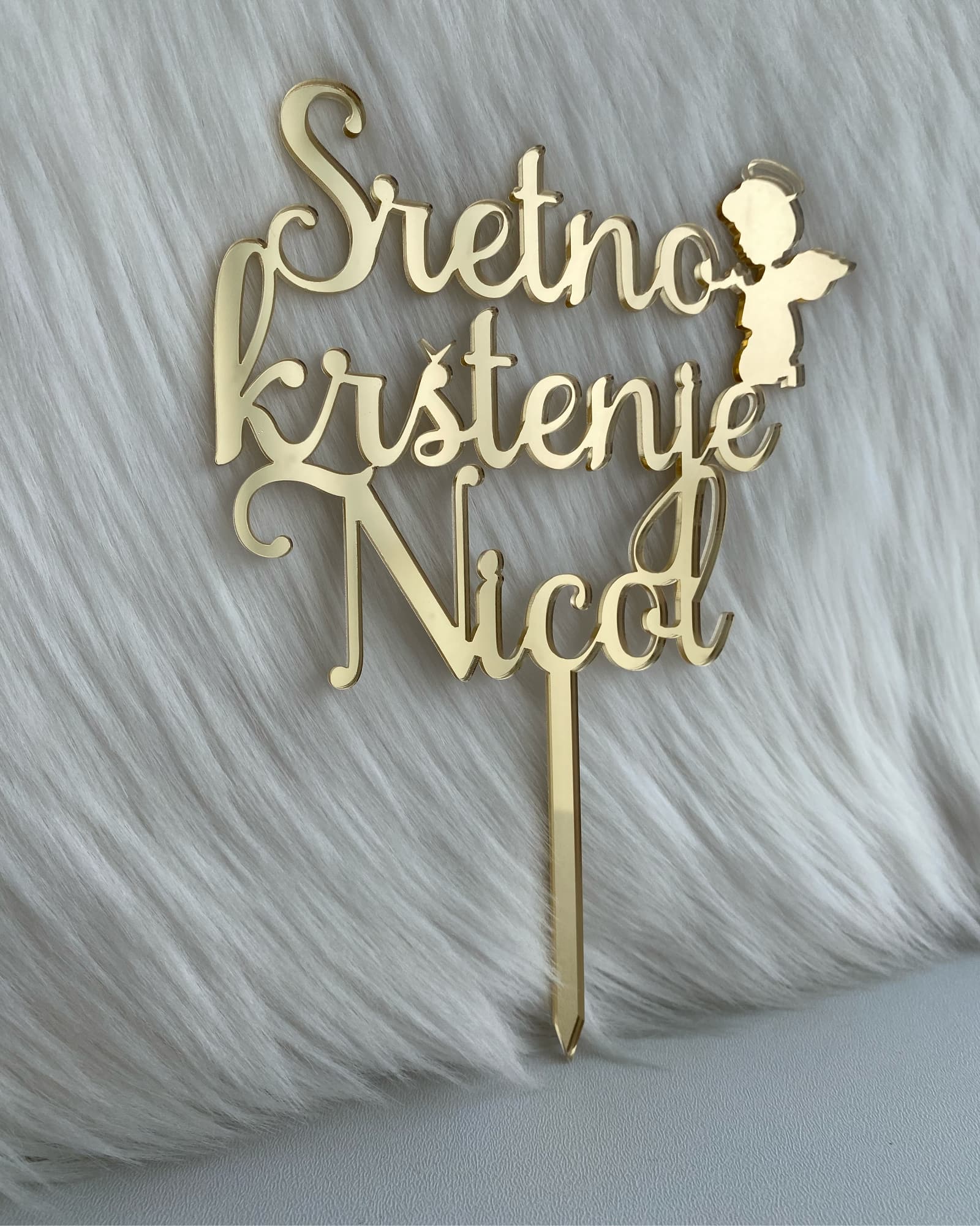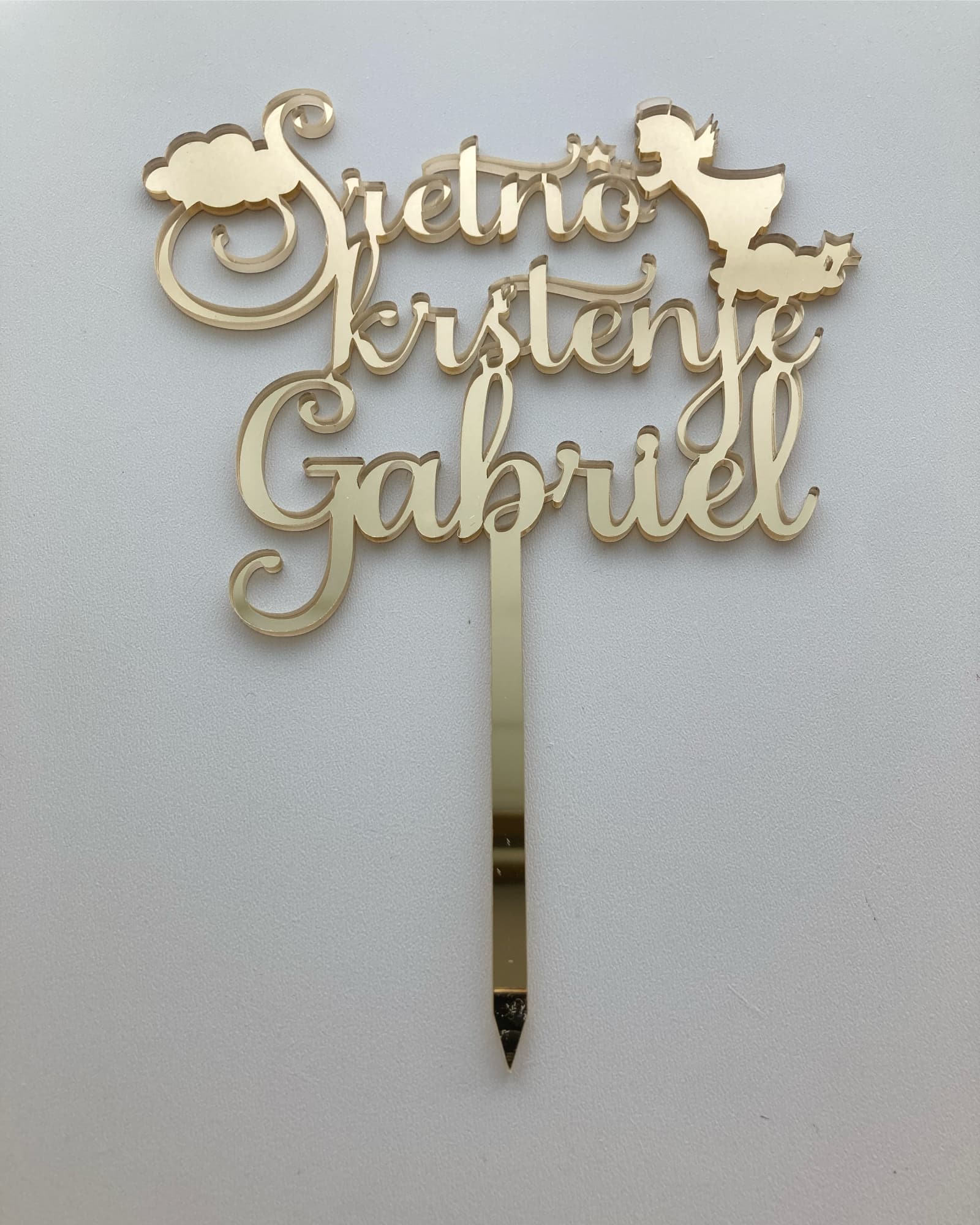 Topper za tortu za krštenje izrađen od zrcalnog plexiglassa. Unesite ime i odaberite boju (zlatna, srebrna ili rose gold).