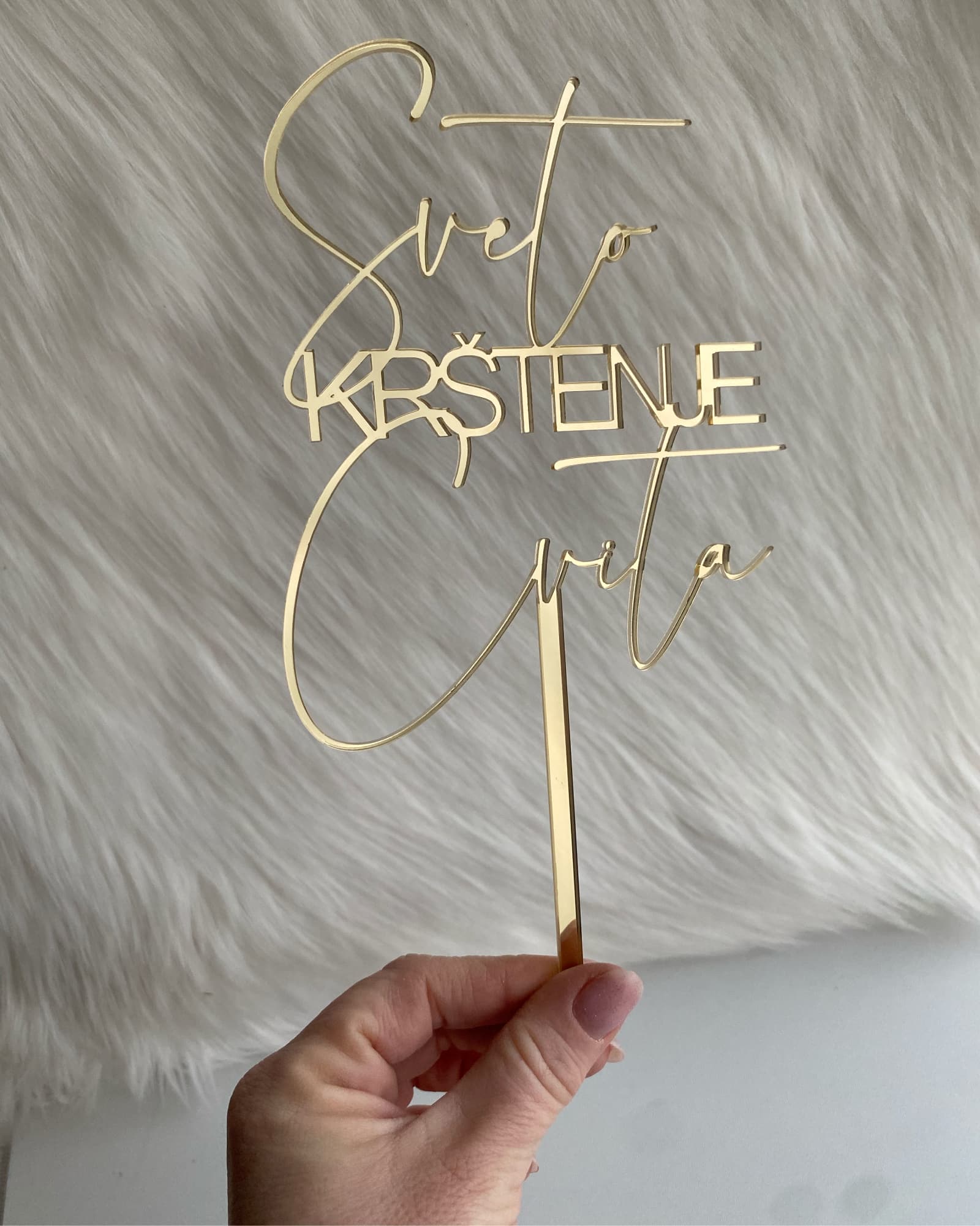 Topper za tortu za krštenje izrađen od zrcalnog plexiglassa. Unesite ime i odaberite boju (zlatna, srebrna ili rose gold).