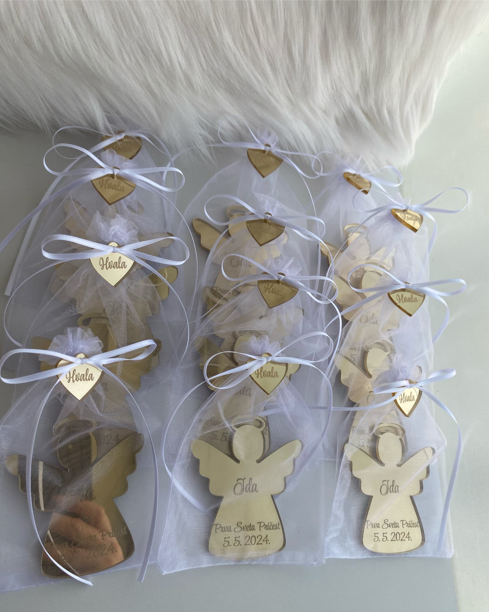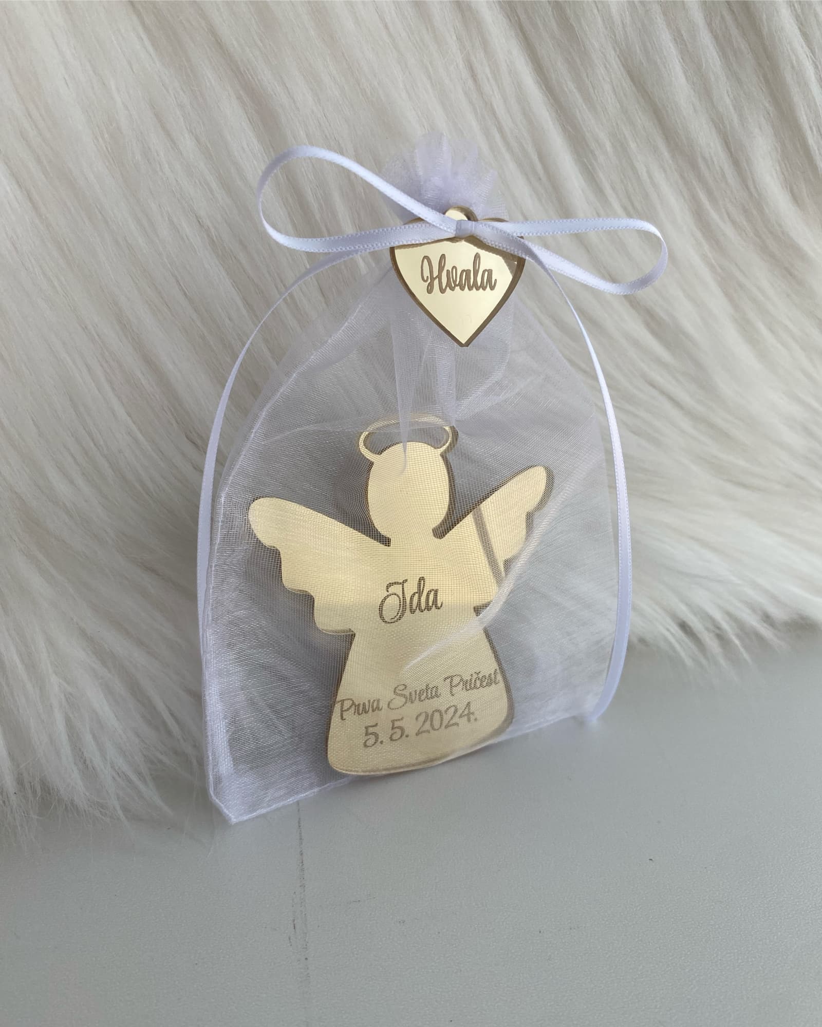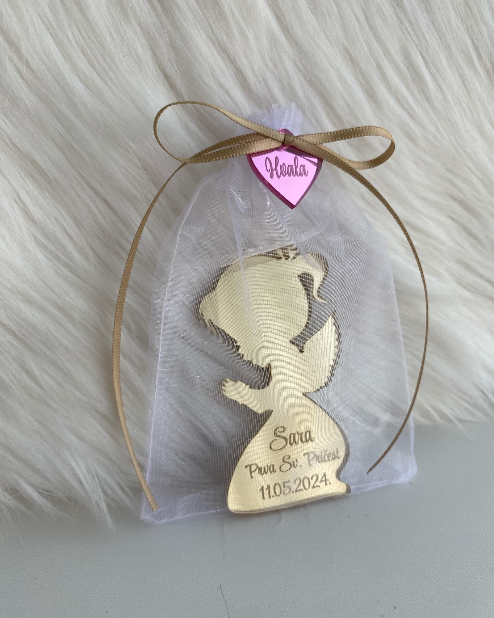 - Opcije: boja magneta, tekst (ime/prigoda/datum), boja trakice i srca